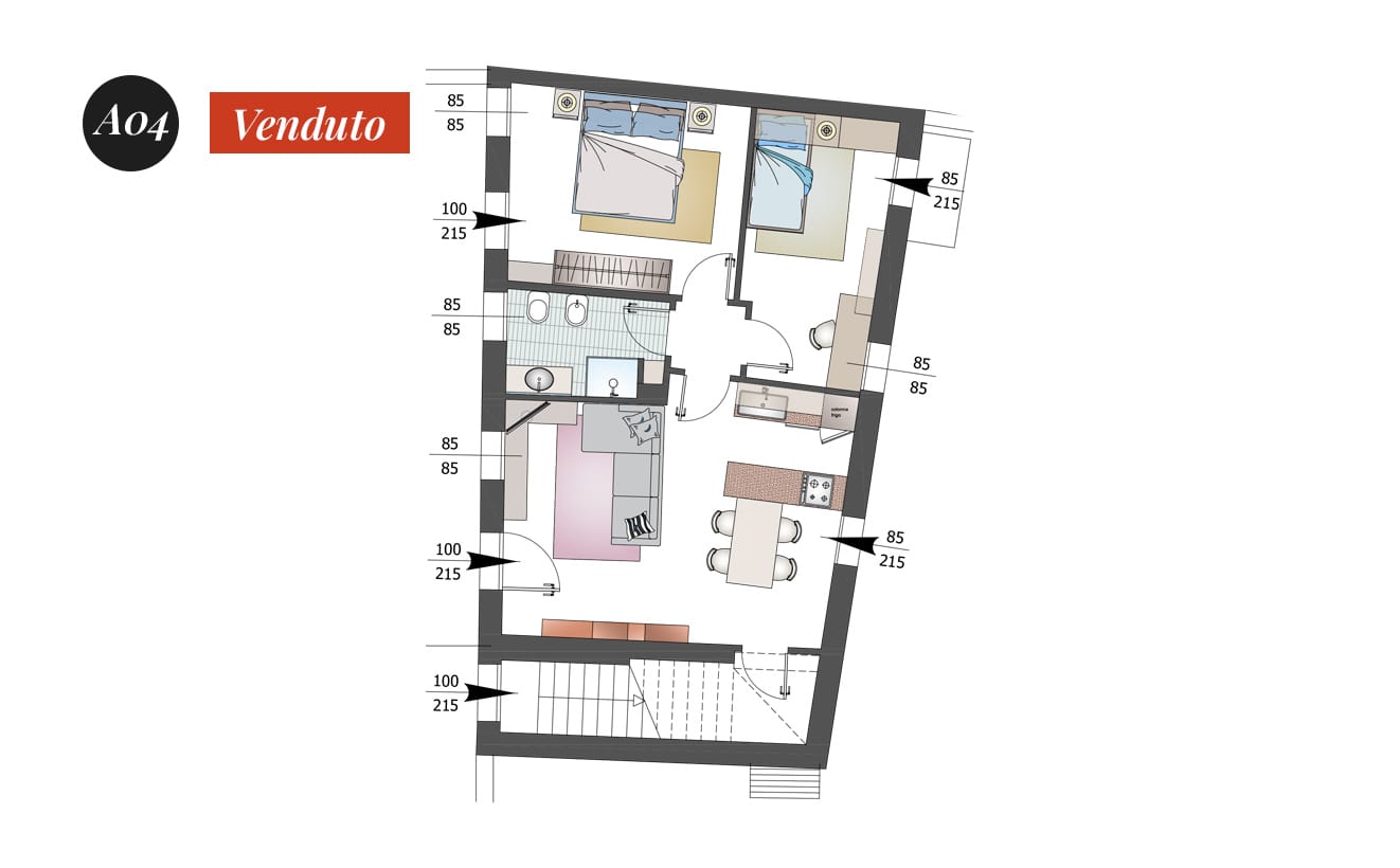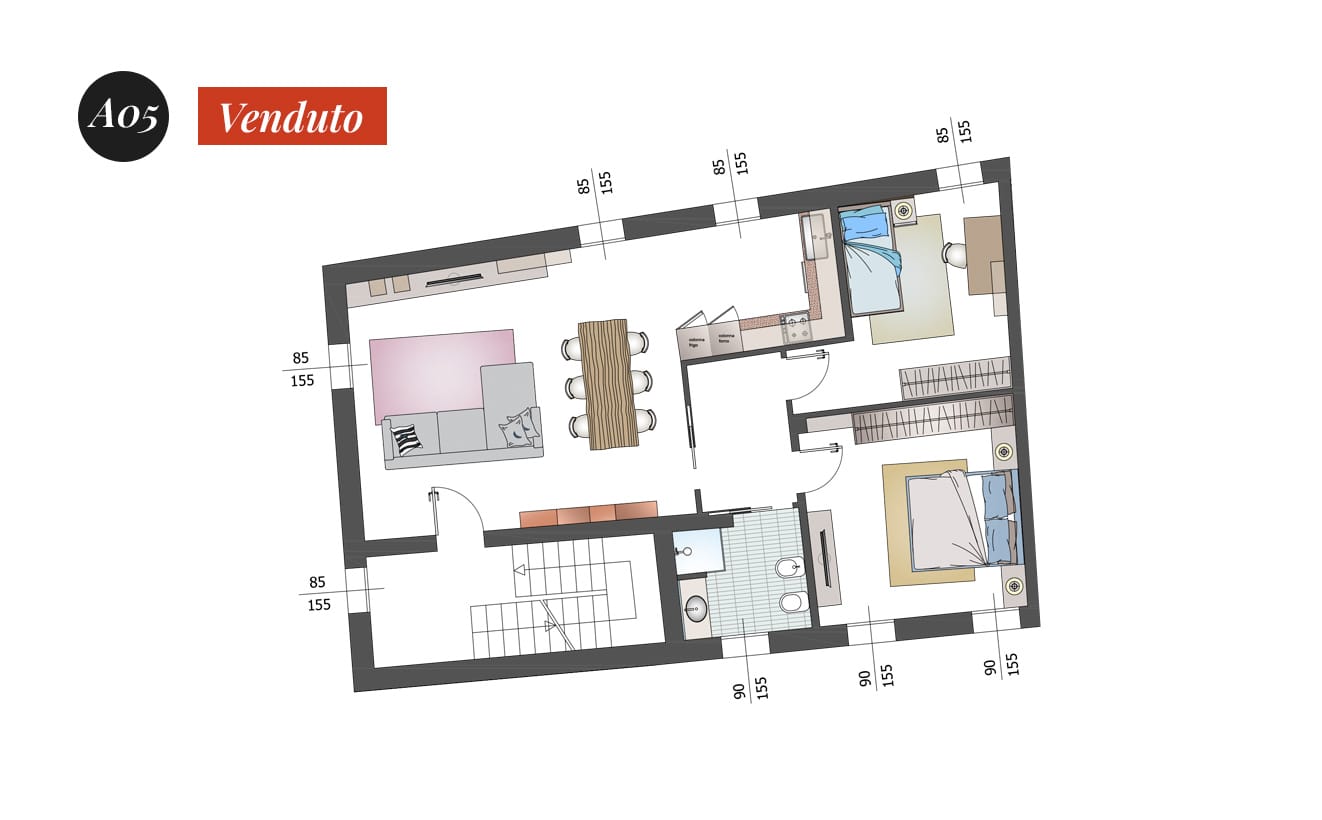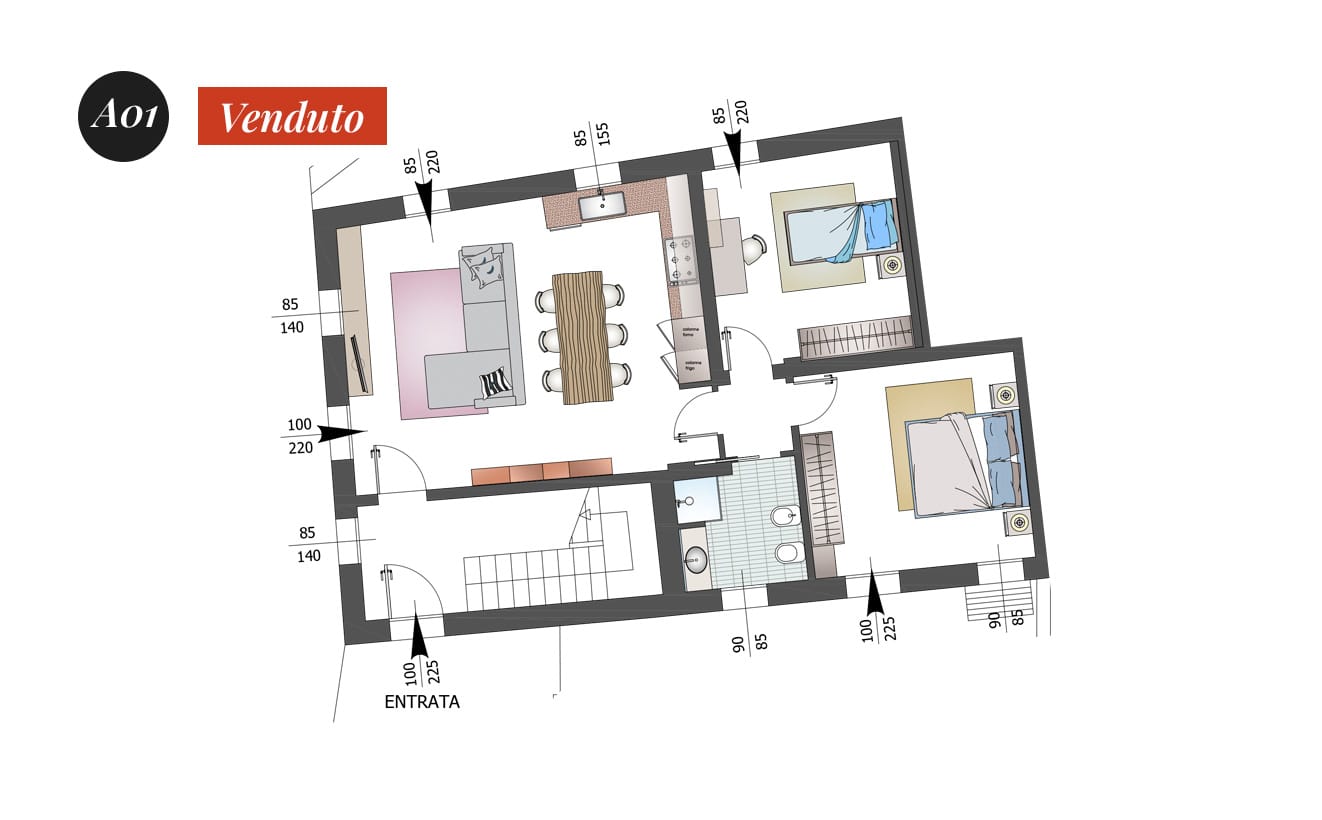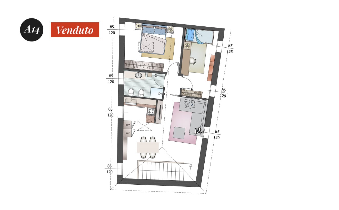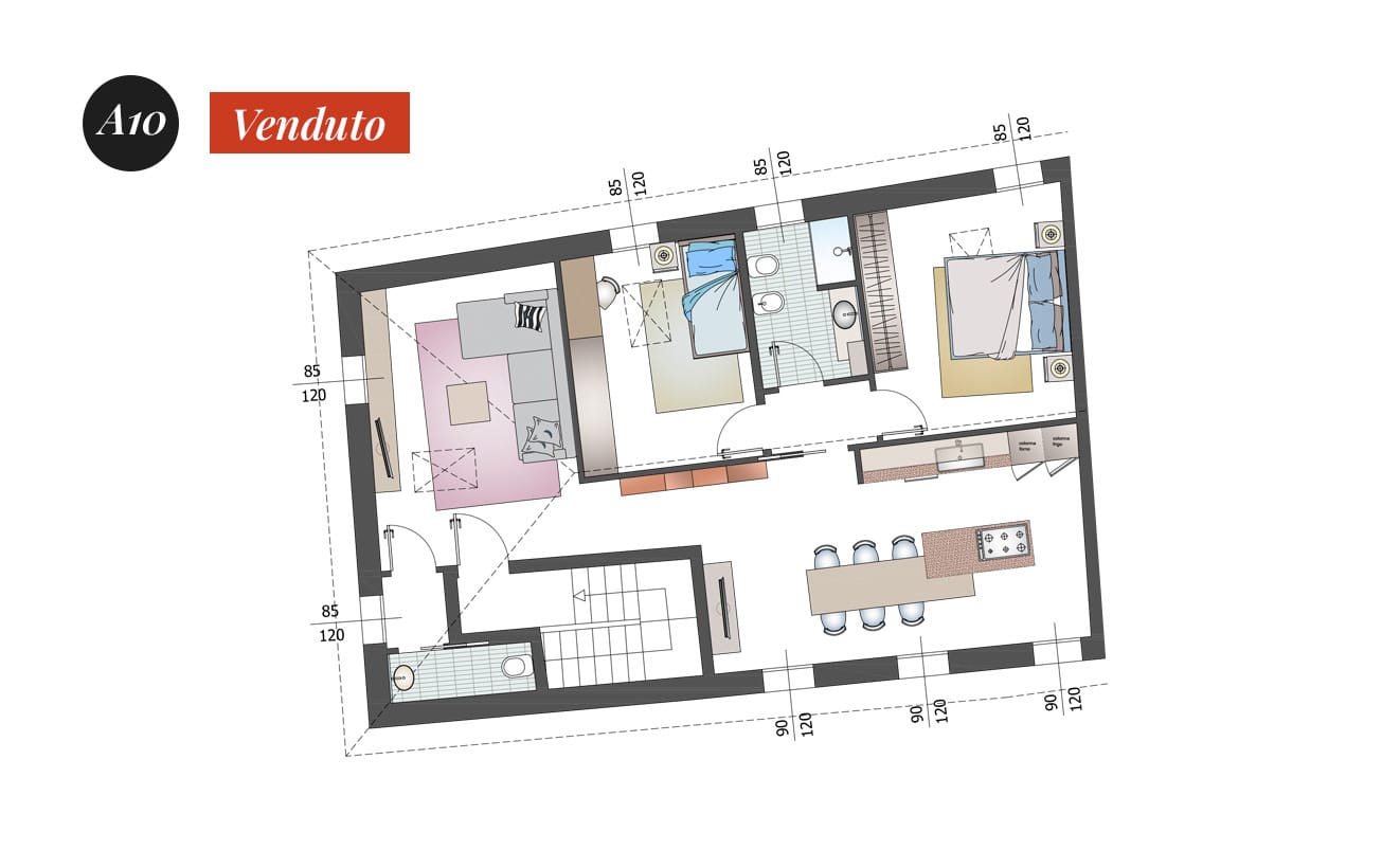 Unità composte da soggiorno con cucina, due camere di cui una matrimoniale, un bagno, garage esclusivo e cantine; le unità al piano terra sono dotate di aree scoperte di pertinenza esclusiva.