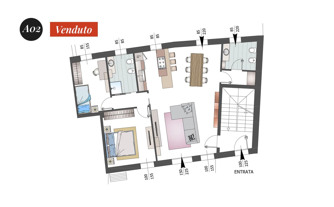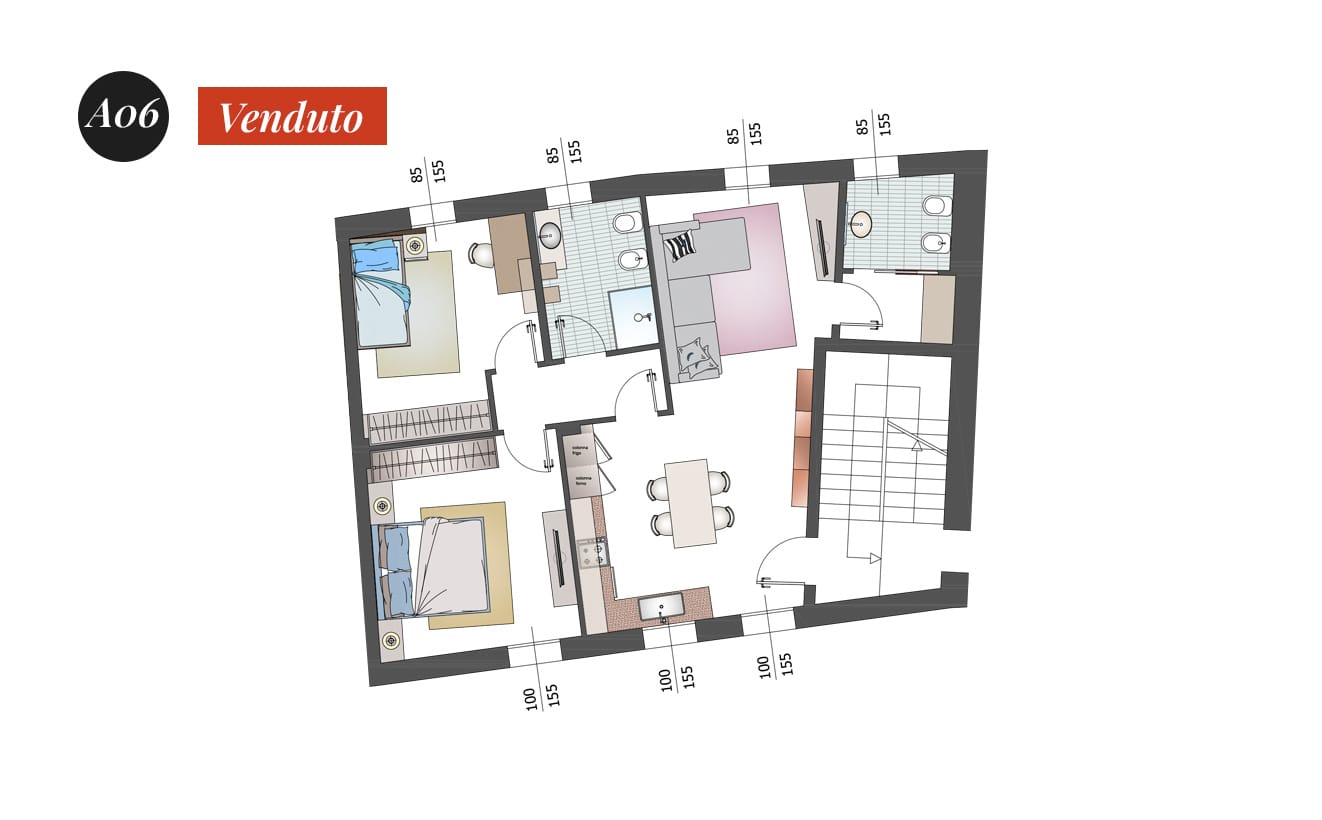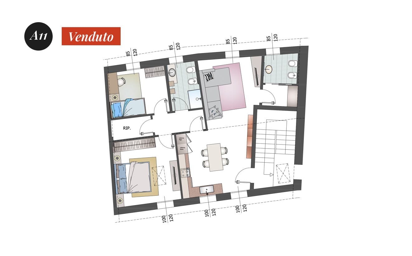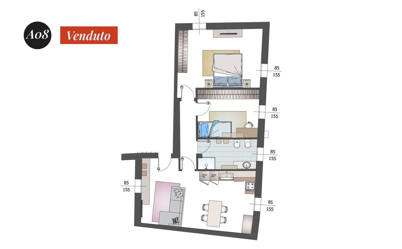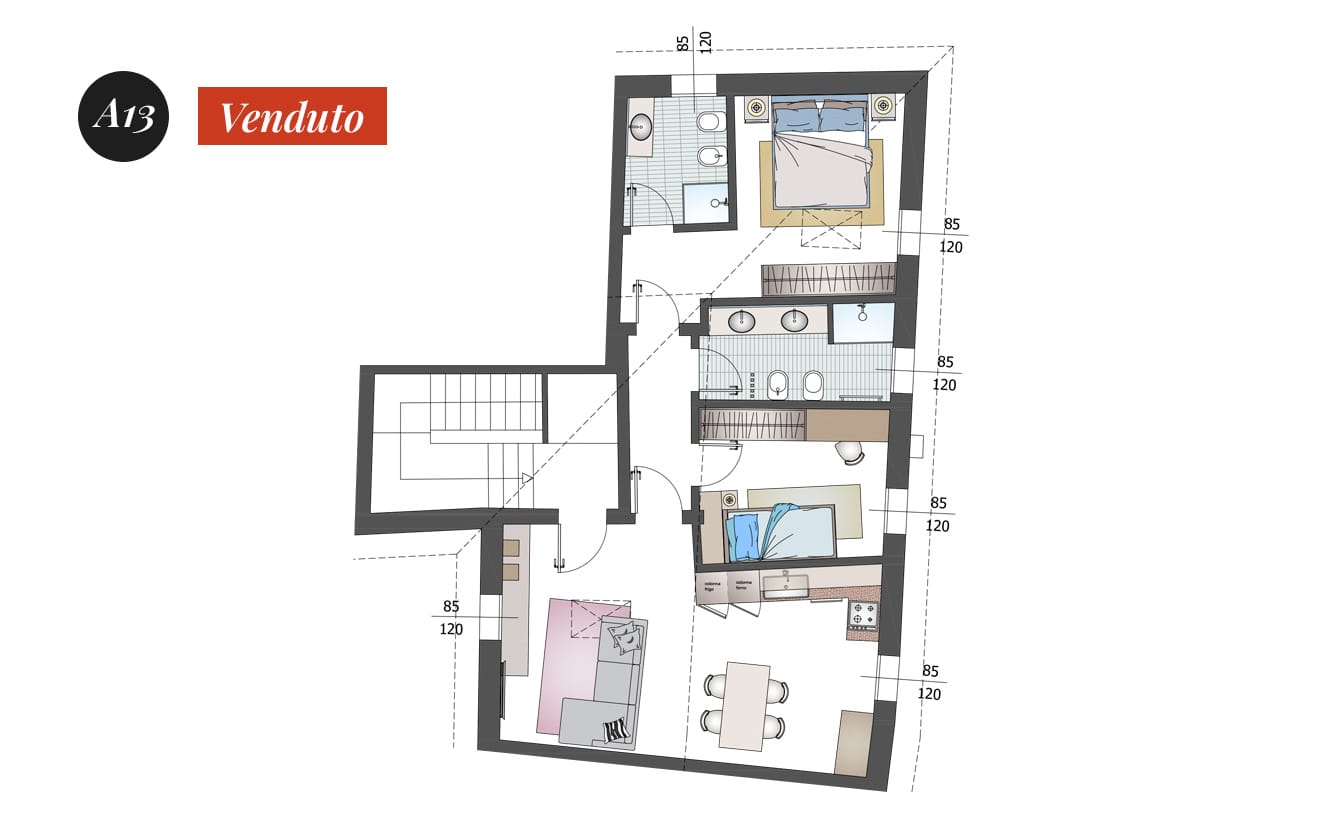 Unità composte da soggiorno con cucina, due camere di cui una matrimoniale, un bagno, garage esclusivo e cantine; le unità al piano terra sono dotate di aree scoperte di pertinenza esclusiva.